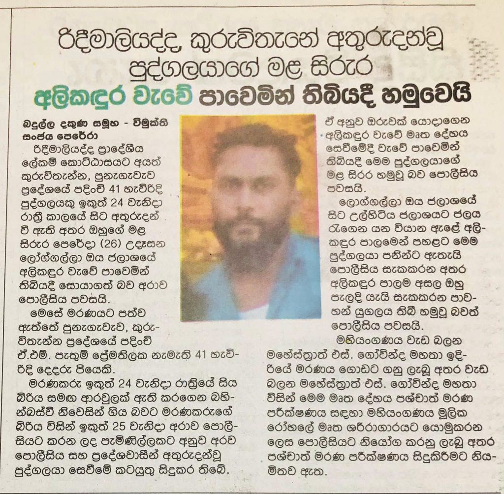 රිදිමාලියද්දේ කුරුවිතැන්නේ අතුරුදහන් වු පුද්ගලයාගේ මළ සිරුර අලිකඳුර වැවේ තිබී හමුවේ Post navigation ඇප නොදුන්නා යැයි පිහිතලයකින් උසාවි කූඩුවේදී ගෙල කපාගෙනහද්දත්තාව විහාරස්ථානයේ ගින්නෙන් ගොඩනැගිල්ල සම්පුරණයෙන්ම විනාශයි… 9:26 PM 3/1/2025