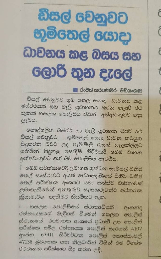 භූමිතෙල් යොදා ධාවනය කළ වැලි ලොරි හා බස් රථ අත් අඩංගුවට.. Post navigation භූමිතෙල් යොදා ධාවනය කළ වැලි ලොරි හා බස් රථ අත් අඩංගුවට..දෙවන වර්ෂ පුර්ණ පිංකම